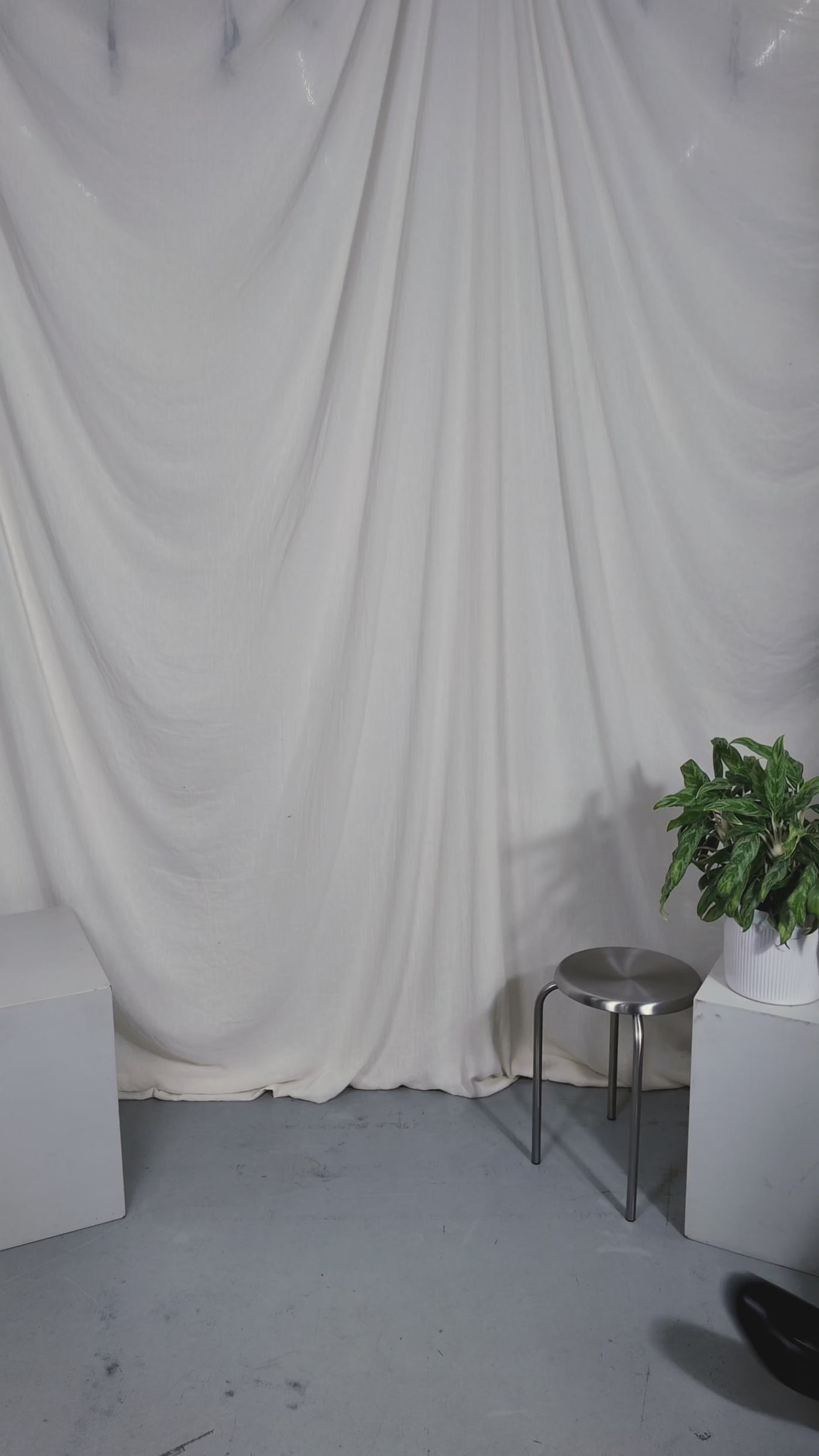 Two people sitting on a stool in a studio setting with photography equipment.