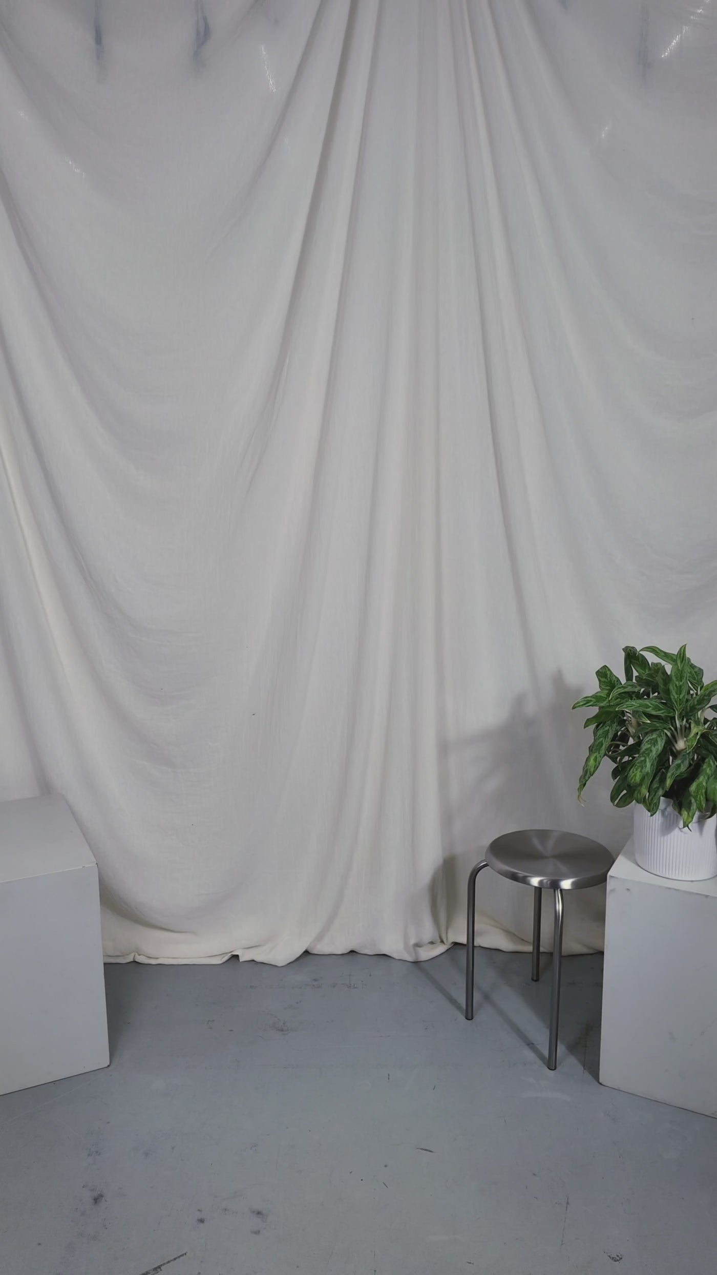 Two people sitting on a stool in a studio setting with photography equipment.
