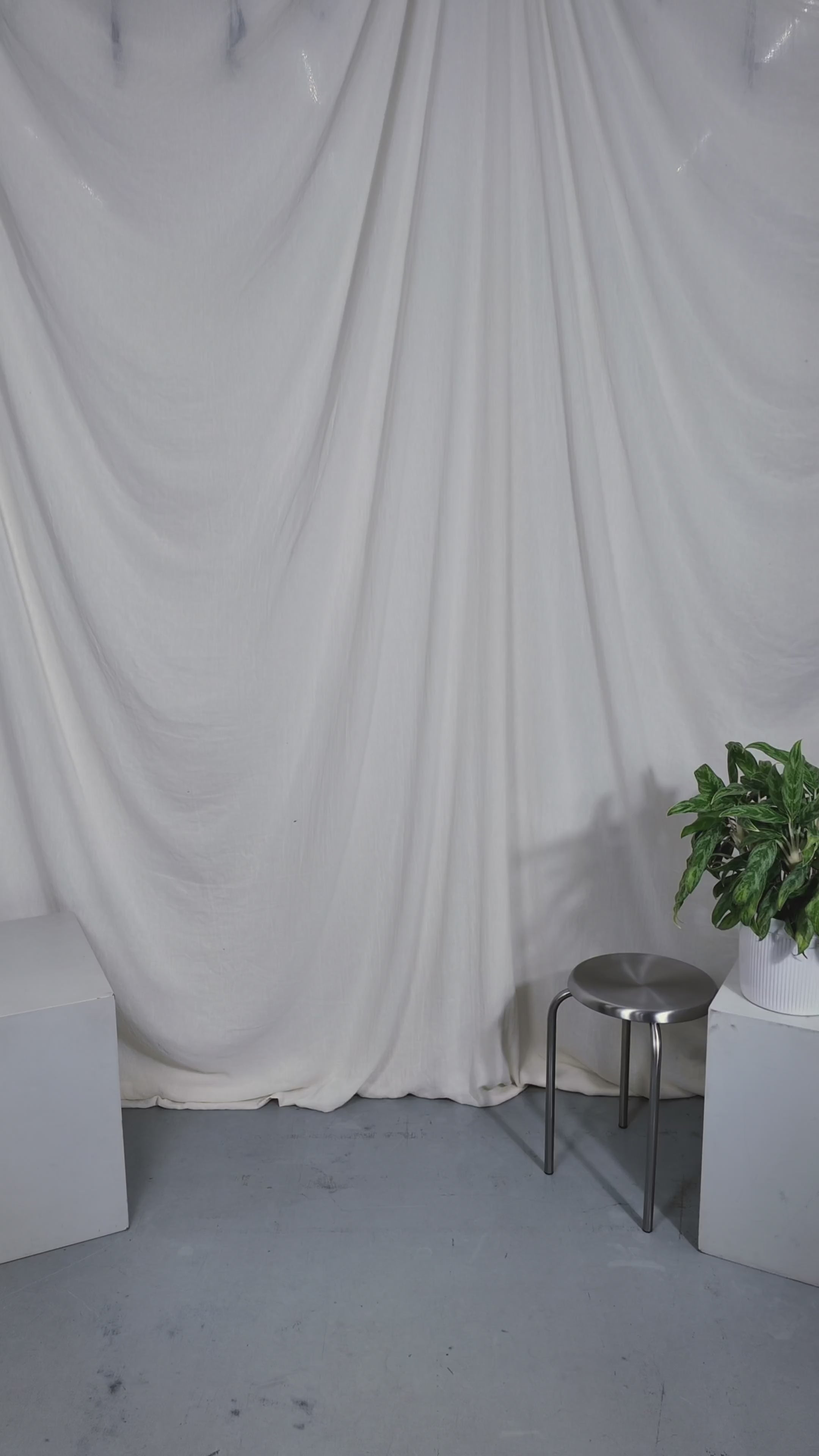 Two people sitting on a stool in a studio setting with photography equipment.